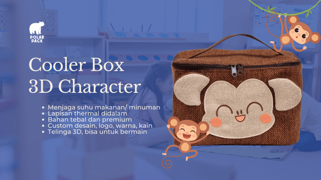 Tentu saja, seperti semua produk kustom kami, Anda tidak terbatas pada karakter monyet saja. Anda bisa mengustomisasi cooler box ini dengan karakter 3D lainnya yang anak Anda sukai. Bayangkan cooler box dengan telinga kelinci, tanduk dinosaurus, atau bahkan kumis kucing! Kain tebal dan premium tetap kami gunakan, memastikan bekal anak aman dan terjaga suhunya di dalam cooler box yang super lucu ini.